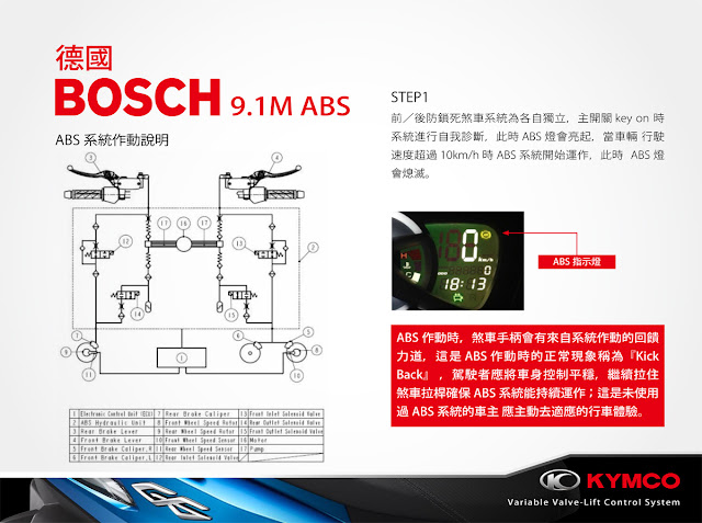 ABS是透過前/後Wheel Sensor取得前後輪速訊息,當煞車起動後經由ECU每 5ms 計算 “減速度” 與“滑差率(Slip Rate)”來判定並控制煞車Caliper內之煞車液壓,避免輪胎鎖 死造成之滑動傾倒,達到最佳煞車性能。